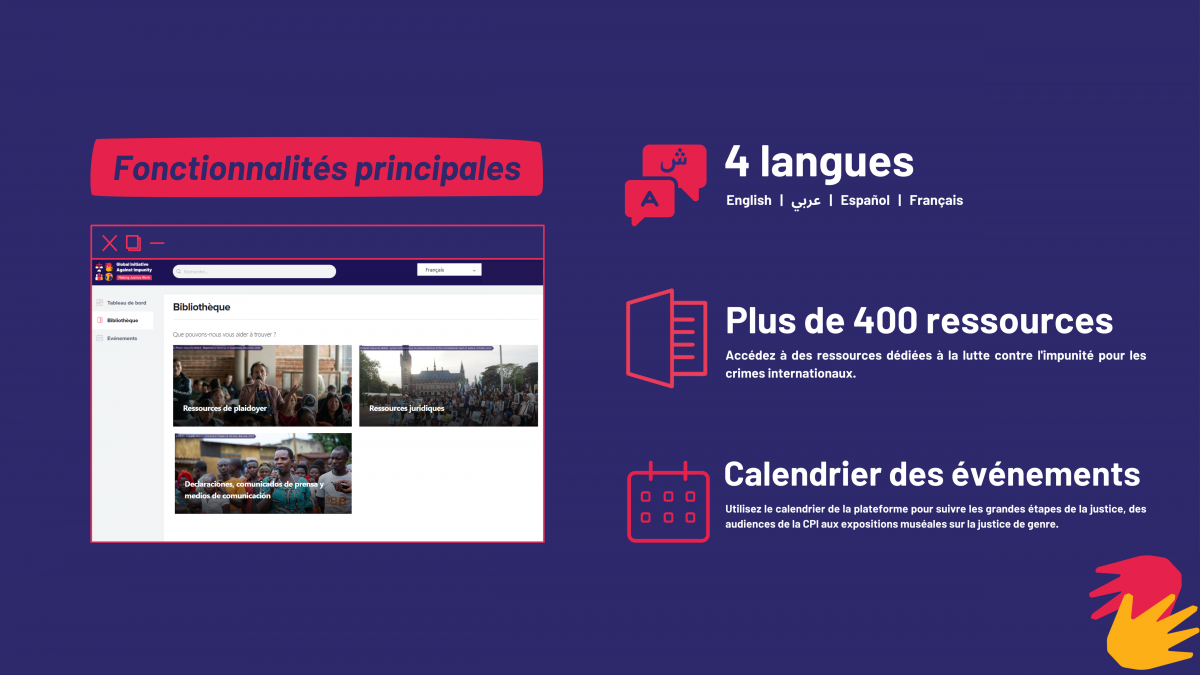 Un agenda interactif en temps réel recense les étapes majeures de la justice internationale, audiences de la CPI, sessions onusiennes, actions de plaidoyer de la société civile, pour faciliter la coordination stratégique.