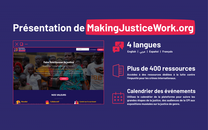 MakingJusticeWork.org est conçu comme une infrastructure pratique, multilingue et conviviale destinée aux acteurs de la justice à travers le monde. Au cœur de la plateforme : une Bibliothèque de ressources curatée et multilingue (notes d’information, rapports thématiques, guides pratiques pour survivants, soumissions amicus curiae, notes de procédure, jurisprudence résumée) complétée par des contenus médias tels que des déclarations conjointes, des communiqués de presse et des campagnes conçus pour favoriser la mobilisation.